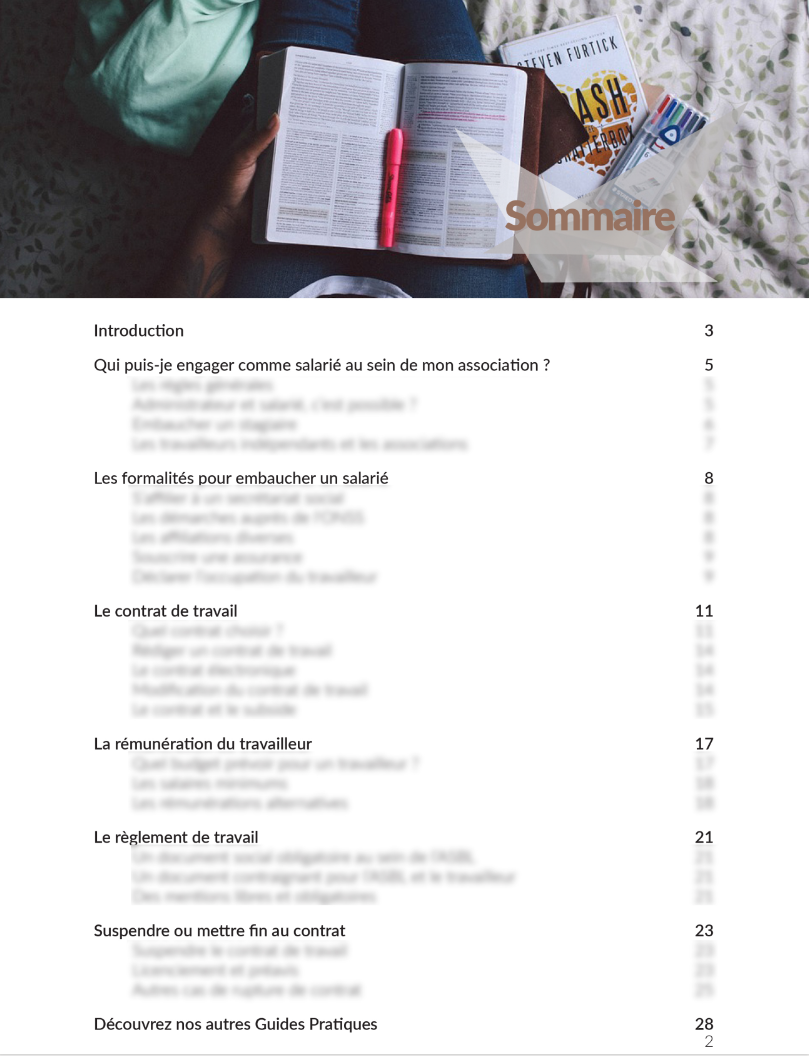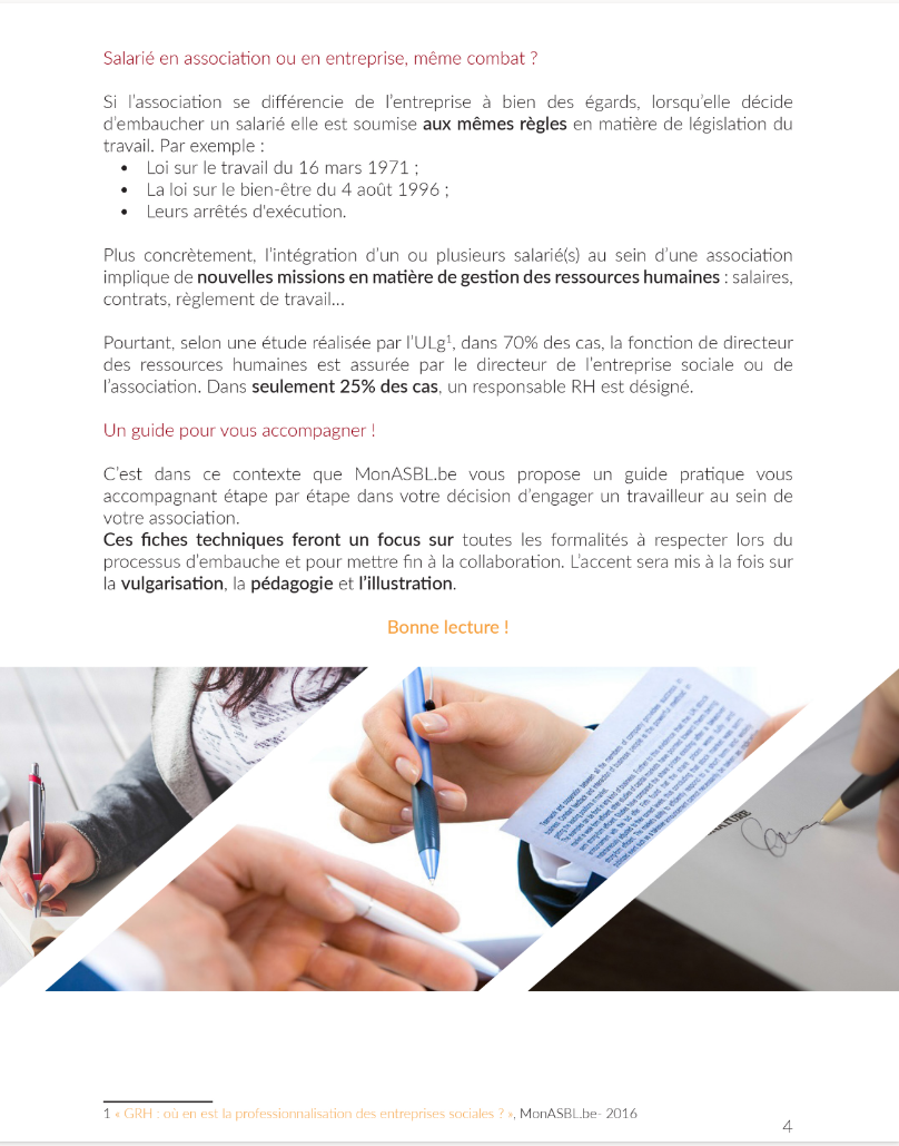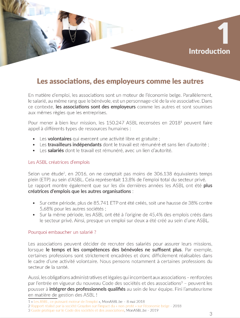 Ce guide pratique vous présente le contexte théorique (les principes juridiques qui organisent l'aspect contractuel) et les avantages d'engager des salariés dans votre ASBl.