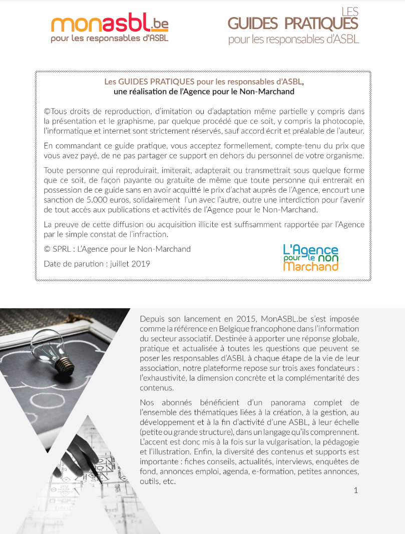 Un guide pratique est un document DIGITAL de plusieurs dizaines de pages qui a pour objectif d'informer de manière simple et pratico-pratique les ASBL sur une problématique bien spécifique. Vulgarisation, pédagogie et illustration sont les mots d'ordre de cet ouvrage.
